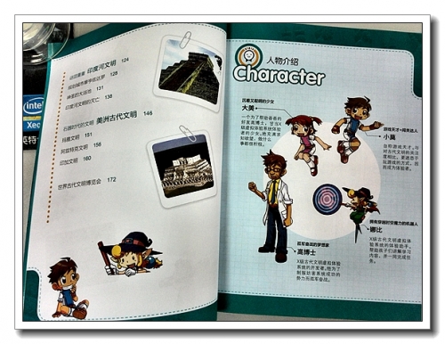 虽然是连环画的形式,内容却也相当丰富。介绍了人类经历的各种时代、古代文明的基本特征、以及每个文明的特点、先进技术、对人类文化的突出贡献等。书里附有许多衍生的小贴士,在不影响故事的连续性的前提下 ,让阅读能力强、有兴趣的孩子们吸取更多的知识,介绍轮子的发展,介绍吉尔伽美什史诗,介绍汉谟拉比法典等等,在黄河文明那篇里还着重介绍了仰韶文化、诸子百家、殷墟和甲骨文。