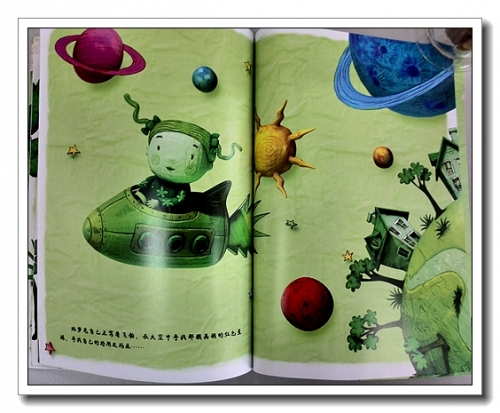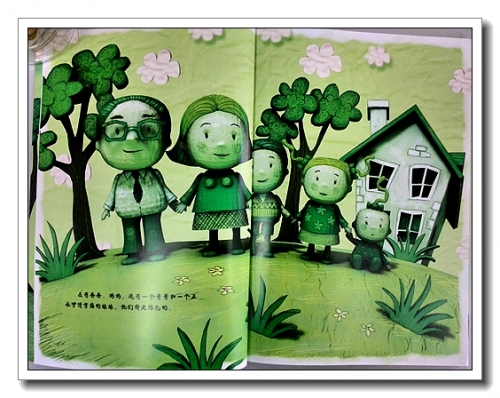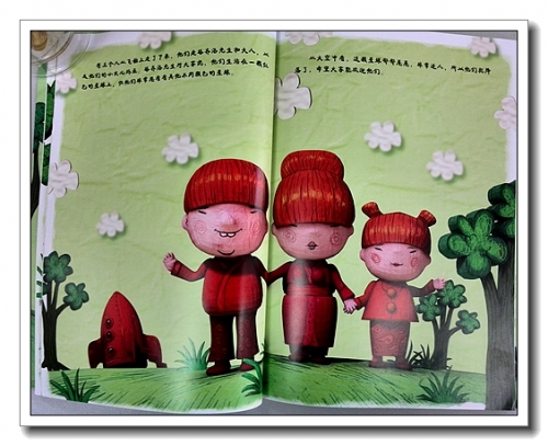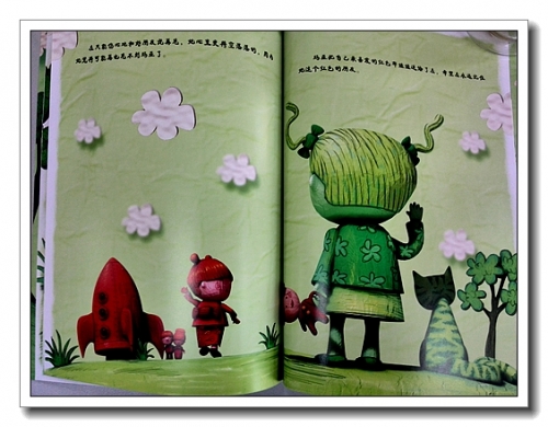 最初看到这本书,是被它的绘画风格所吸引。作者用计算机技术将3D形象和2D背景有机的结合在一起,形成一种富有冲击性的视觉画面。里面的人物形象很有意思,皮肤不是光滑的质感,而是似粗糙的木雕,还保留着刀斧的痕迹;或者3D建模后,直接蒙了张皮,网格依稀可见;又像是我和婷前几天捏的纸粘土娃娃,为了节约成本,里面是用卫生纸团的芯,再包上纸粘土,如果不够厚,就会有这种不甚平整的感觉。人物的表情也简单,就像我们用碳素笔随意涂鸦的,还能看出红脸蛋上拿凌乱的螺旋。我却是极喜欢这种风格,有一种返璞归真的感觉,而且立体感很强。红色和绿色的搭配,清新醒目,让人印象深刻。