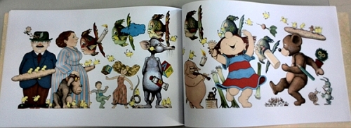 翻开下一页,世界变得更加荒诞,茶壶成了像热气球一样的飞行器;鸭子们在长颈鹿的身体上滑滑梯,坠入母鸡的身体;蘑菇不仅是猫儿的房子,还会吹奏萨克斯管;桌子和床也随着音乐开始癫狂。绅士站立的凳子,看起来有点像背后雪山上的一个山洞;阿黛拉带着满车的鸭子们前进,轮胎眼看要扎上钉子。
