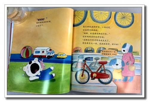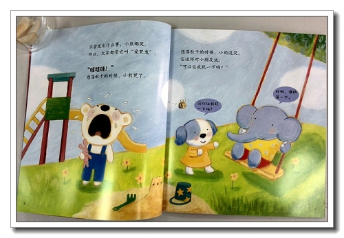 《不要哭,清楚地说》,里面列举了许多情况,比如想玩可是轮不到;玩具坏了;爸爸妈妈要出门;不舒服等等,都是孩子经常会遇到,引发情绪不稳定的情况,书里通过小狗和小熊的对比,很认真地教给孩子,这种情况应该如何表达,要勇敢、清楚地说出自己的想法,哭解决不了问题,而正确应对,却有可能达到自己的目的,忽然想起唐僧的一句名言——“你想要的话你就说嘛,你不说我怎么知道你想要呢,虽然你很有诚意的看着我,可是,你还是要跟我说你想要的啊。”不仅如此,书中还给爸爸妈妈一些提示,当孩子很认真地提出要求时,爸爸妈妈应该如何回答,同意应该怎么做,不同意又应该怎么做,不是简单的拒绝,而是应该跟孩子说清楚拒绝的原因,或者实现孩子愿望的条件,以帮助孩子正确理解自己的要求。