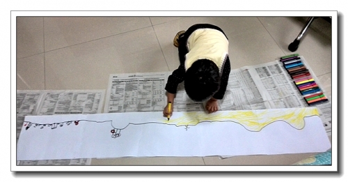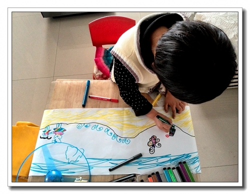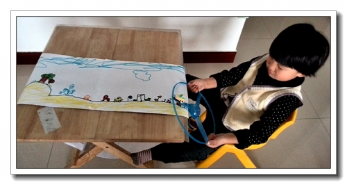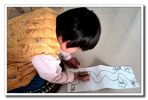 把几张B4纸粘在一起,很长很长。婷第一次在这么长的纸上作画,很兴奋。没有按我说的去画公路,而是自己想象着画了一路上的风景。把纸卷在小桌子上,用手拖拽纸张,让它转动,就成了循环的道路。婷玩了一会儿,大叫:“妈妈,你知道少了什么?”“什么?”“信号灯!”加入信号灯,果然,游戏有有趣了一些。
