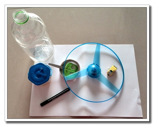 正好有个玩坏了的陀螺,小汽车一辆,白纸(环保起见,建议废旧利用)、画笔、胶棒、大瓶子等(大瓶子后来改良升级了)。