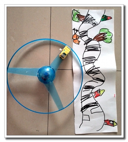 把汽车粘在陀螺上 。婷画的公路,把公路卷在大筒上就可以玩了。一人滚动筒子,一人操作汽车,不能出轨。可惜我家没大瓶子,小瓶子的话滚动太快,玩得不过瘾。后来有了升级版。