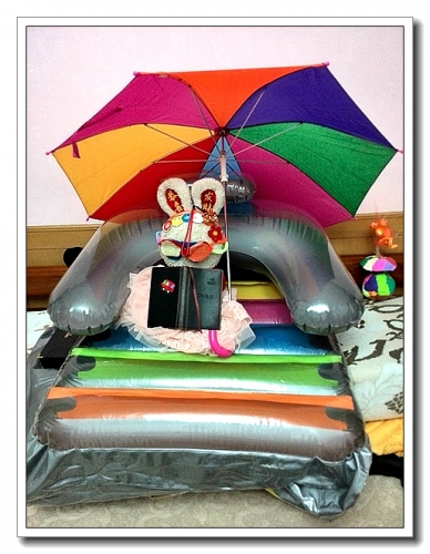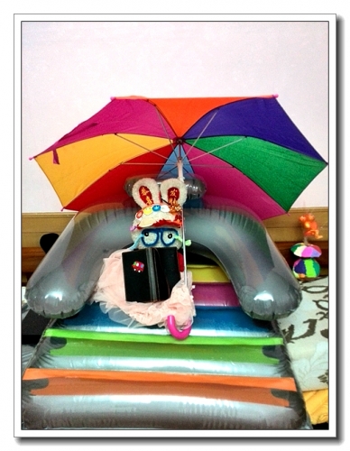 还有戴着墨镜晒太阳的兔子——除了那个蓝框眼镜是我做的,其他均是婷摆置(包括她做的绿橙墨镜,来源于姥爷的立体眼镜)。那个黑皮本是婷的日记本——每天往上面写些唯有她能看懂的天书。旁边还放着我们的“乞丐瓶”。