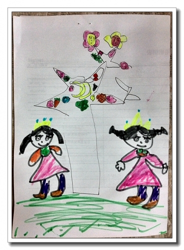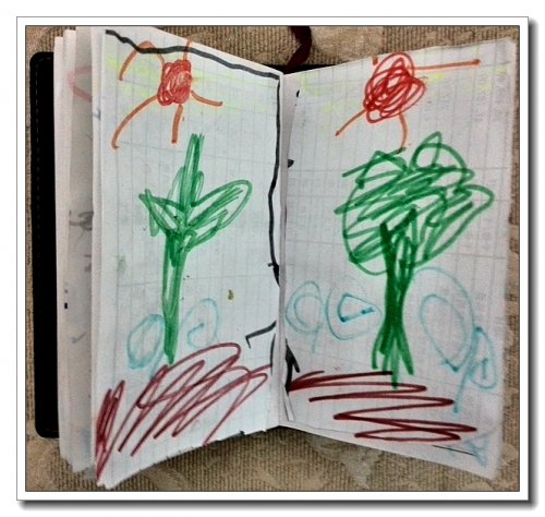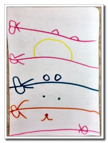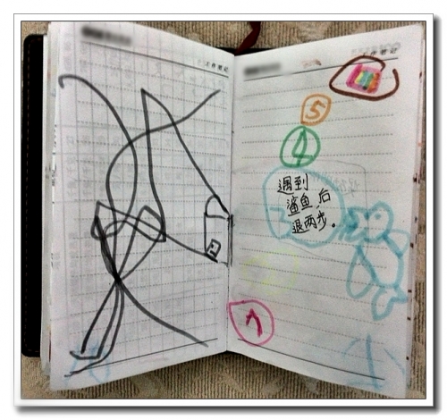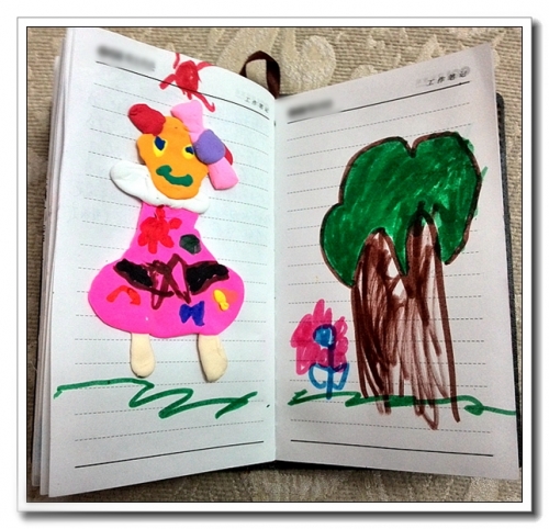 婷有一个黑皮本,每天往上面写天书,那几天画了很多东西上去,说是《小兔子的游戏书》,里面有找不同、迷宫、棋、剪纸什么的。里面那个剪纸颇有意思,我让她剪下来,婷舍不得剪她的书,拿白纸又画了一张,然后拼了出来(自己画自己剪贴)。