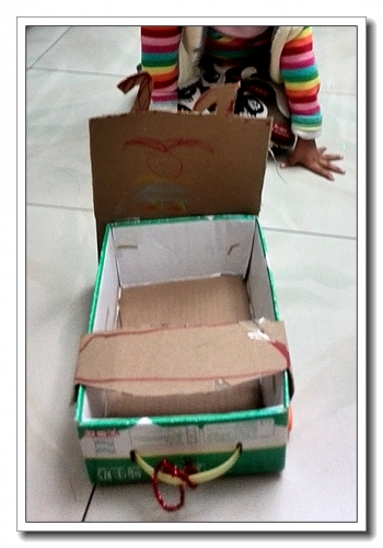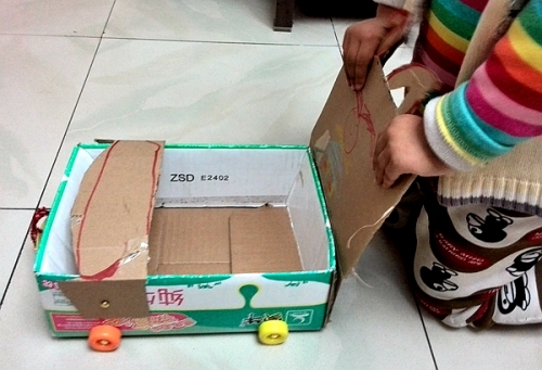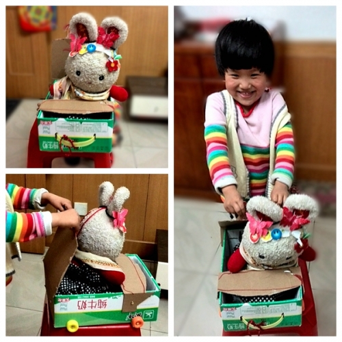 等我从厕所出来,看到婷和姥爷已经做好了一个“呼拉圈”——把硬纸盒剪成条,用线缝起来(本来我爸说要用钉书机,我妈怕扎着孩子);正在给兔子作“婴儿车”——婷的设计师,姥爷的工程师,我的助理:把婷小时候一个玩具的轮子用两脚钉装在奶箱子上(简单牢固,而且轮子可以转),然后把硬纸盒子剪成把手的样子装上(纸盒的背上特意画了小兔子,表示这是它专属的车),把兔子放进去后,婷说还少个东西,又拿纸片做了个挡板,还特意修整成弧形。