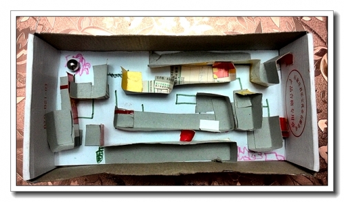 顺便把前几天给婷做的迷宫留个纪念。用的个酸奶箱子和几张硬纸片。先是做了一个,婷觉得过于简单了,又费了1个多小时做了一个,没想到还是很简单……更悲哀的是我的画图技能,自己琢磨了半天,还画了图纸,然后才动手,很多地方偏离图纸不说,还多出了一条路,是婷指出来的,赶紧打上补丁。婷画了小兔子迷路了,需要我们帮助它找到妈妈。