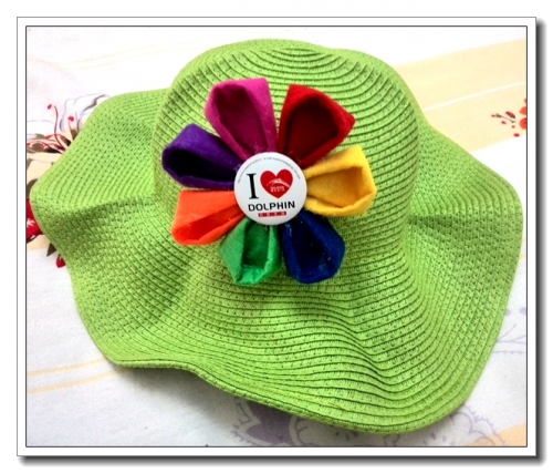 帽子回来后,婷很喜欢,在纸上用油画棒画了一朵彩色的画,要把它剪下来贴到帽子上。在我的委婉阻止下,婷同意跟我一起做朵花放上去,但必须得是彩色的。还好家里有些不织布,各剪个小方块,折朵花出来,中间的花心选了海豚出版社的一个胸章(婷是胸章控)。