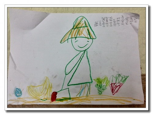 这是一位农民,正在种地,用的工具是铲子,不过葡萄、香蕉什么的……
