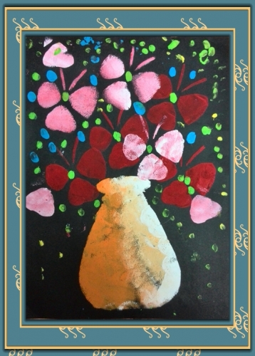 这幅画看起来很美吧,其实不需要太多的技巧。用纸剪个花瓶、花的洞,然后用海绵蘸颜料点,主要在于过渡色,渐变的效果很漂亮。婷的最爱,红黄蓝绿橙。