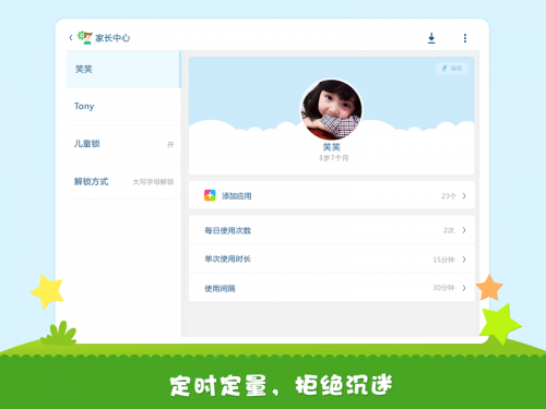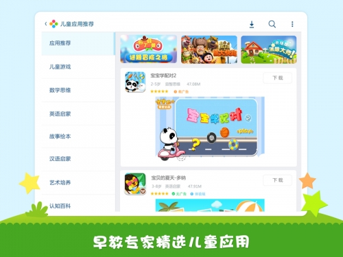 应用中心采用左右栏设计,方便快速切换分类,了解各个分类下的儿童应用