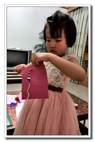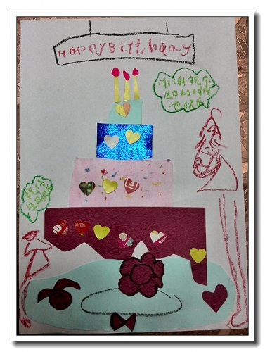 婷快过生日了,想吃蛋糕,正好这本书里有,就动手做喽。不过我们没有那么多鲜艳漂亮的纸张。婷会剪波浪形了。装饰完蛋糕,婷还让我教她写了“Happy birthday to you”,旁边还画了小朋友,让我给她写上两个孩子之间的对话,当然还邀请了小兔子参加。