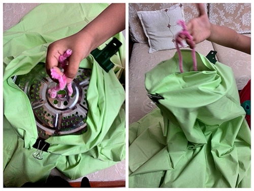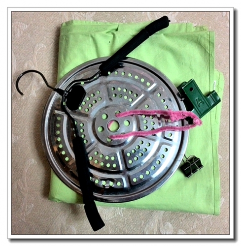 找来篦子(蒸馒头时用的)一个、夹子若干,翻箱倒柜想找个破床单,却只找到一新的几乎没用过的,赶紧先放下工作,去铺地垫防脏。把床单用夹子夹在篦子上,没待找绳子,随手揪了根婷的扭扭棒穿过篦子的孔洞(篦子这点是好处良多啊,太好固定了),找了个衣架挂在晾衣杆上(话说早就有这个主意了,当时是一直想不到该往哪里挂,正好婷选的地方合适啊),帮婷把凳子什么的搬进去,一切ok。