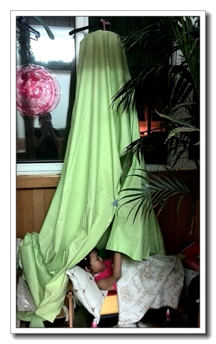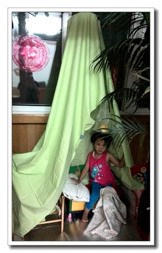 因为热,不想让小窝太憋气,两边放了小凳子什么的把小窝撑开点。里面还吊了个充电的大手电筒(用塑料袋装起来,挂在一个套一个的衣架上,婷说像小猴子)。婷进去试了试,就开心得不愿意出来了,说是在野外露营呢,还抱了抱枕和沙发垫当枕头、被子,让我们把所有的灯都关了,她开着自己的小灯。