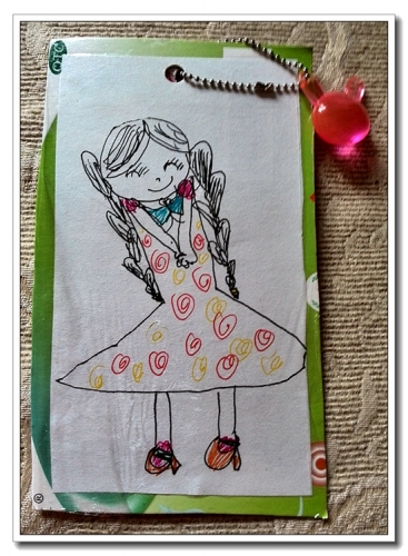 小女孩的麻花辫、袜子上的小花边的精细就不说了,双手握着的姿势、笑眯眯的表情,那么得自然。赶紧覆膜贴好,穿了个小挂件,拍照留作纪念。