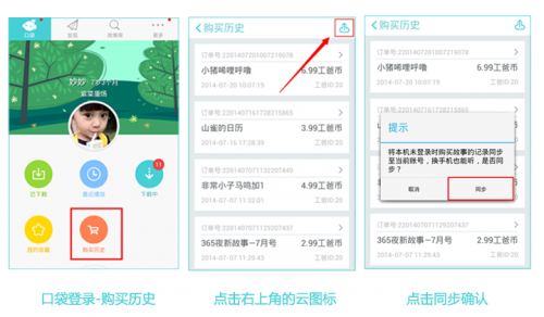 在【口袋】界面点击宝贝头像登录,进入【购买历史】界面,点击右上角的云图标(如图所示),然后点击【同步】确认,即可将本机未之前未登录时购买的故事同步绑定到当前账号。