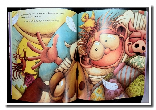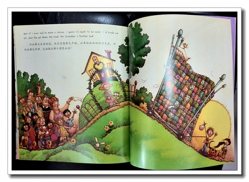 一大家子人坐着一辆老爷车去奶奶家,可以做着做那,但最让人怀念的还是那张超大的羽毛床。羽毛床果然用了很多的材料,看看画面,堆布成山,羽毛纷飞。床上坐了8个孩子,4只狗,还有一只小肥猪。拼布风格的被子好漂亮,各式各样的孩子好可爱,哦,还有一只小鸡在头上。