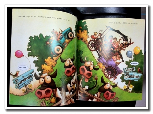 听着音乐来看书,就像歌曲很轻松一样,画风也是活泼温馨,让人不禁会心而笑。书后附了曲谱,书内文字是中英文对照的歌词,歌词非常有韵律,让人琅琅上口。听着音乐,看着绘本演绎,很多歌曲里隐藏的故事,在画家的回忆里重现。夸张、滑稽、热闹,仔细看画面,比文字丰富许多。