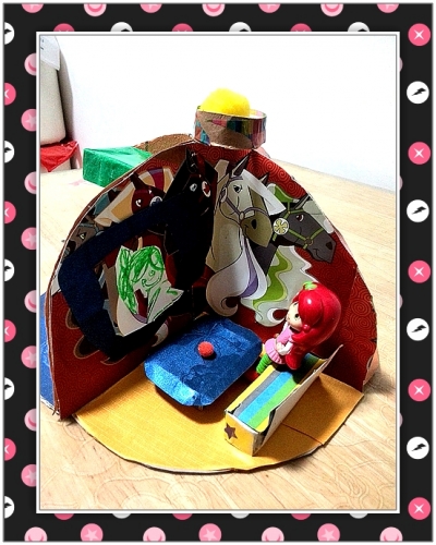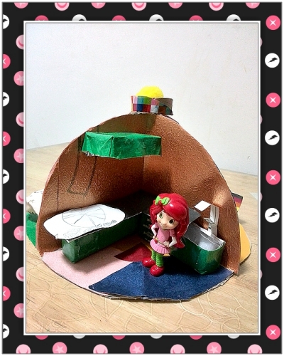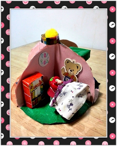 快递袋子做的房间,没画图纸,随手剪的,很不规整。壁纸、地砖也是尽量废旧利用。这个马桶是我比较满意的,纸巾盒子剪下来的那个口,稍一修剪,极为现成。毛巾牙刷都可取下,便于草莓甜心使用。顶上是婷做的灯,明晃晃的耀眼。