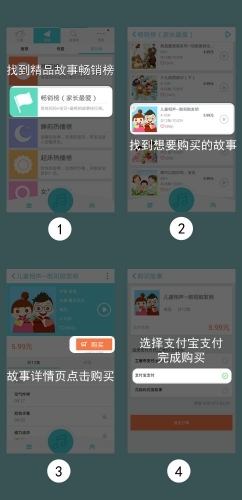 在【发现-排行榜-畅销榜】或【故事库-精品-精品故事】里找到想要购买的故事,点击进入详情页后,点击购买,然后选择相应支付方式。