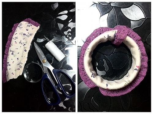 刚好剪开个饮料瓶子当自制橡皮泥的模具来着,顺便又剪下一条来,比了比,宽,错回点来用双面胶粘住,找来以前绞过的一件旧睡衣,取了领子部分,速速缝合,剩下的事情就交给了婷——前几天给她买了一些水钻贴纸,由她随意装饰。几分钟搞定。虽然粗糙,婷却喜欢得很。