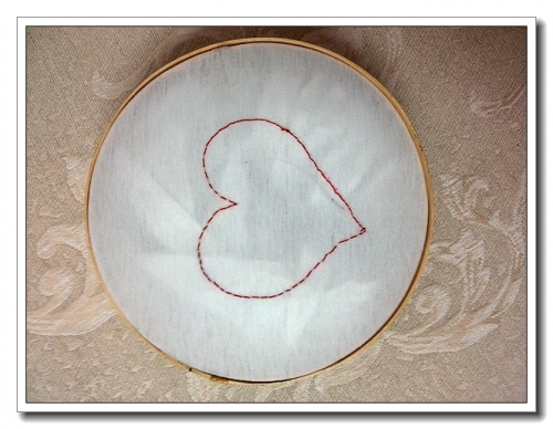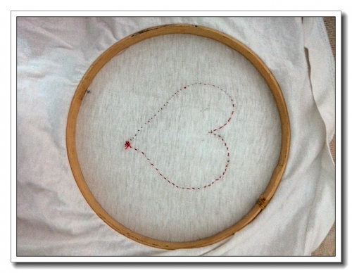 昨晚看到了妈妈不知从哪里翻出来的绣绷,婷要求绣花。找了件旧T恤,随手画了个桃心。我捧着绣绷,婷开始刺绣。我是手笨的连十字绣都不敢动手的,所以也不会教,只给她挽了个疙瘩,由她自由发挥。婷却越绣越让我吃惊。