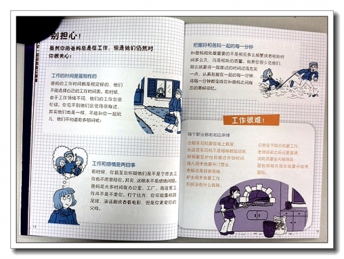 《这就是生活之爸爸妈妈陪陪我》,肯定是每一个孩子最希望,但父母却最矛盾的问题。书里用同样的方法,从各个方面交给孩子如何面对工作缠身的父母、日理万机的父母、心不在焉的父母。告诉孩子,没有时间陪她并不是不爱她,要把握好跟爸爸妈妈相处的每一分钟。同时也告诉父母,要珍惜与孩子相处的每一分钟。书里还告诉孩子联合国起草的《儿童权利公约》,儿童有权表达自己的想法,这很重要。