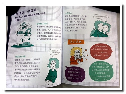 再接下来告诉孩子,犯错误,很正常,每个人都会犯错误,还列举了一些名人名言。“太多借口反而让事情变得不可信”,这句话最适合婷,她总是找很多借口为自己的行为,反而让人失去听下去的欲望。最后又给了孩子一些建议,接受犯错误的小技巧。
