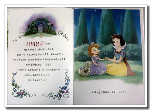 故事里还出现了一位我们很熟悉的人物——白雪公主,她现身说法,给苏菲亚讲了毒苹果的故事,这让我想起曾经看过的一个帖子,一位聪明的妈妈把公主故事改编成了安全教育,白雪公主就是一个典型的例子。真好,利用耳熟能详的故事,在迷恋公主的小女孩心中,种下一棵自我防护的种子。