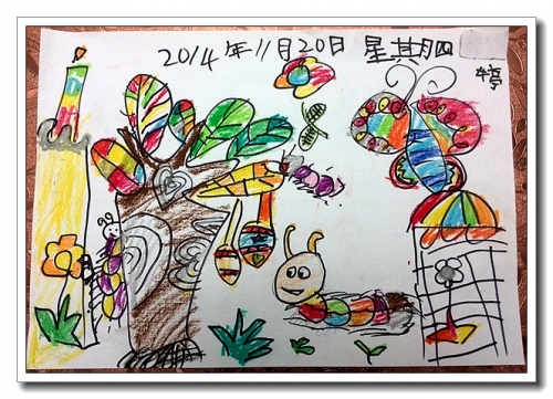 昨晚看了第一集,这个视频的好处是老师讲的比较生动,比如这节毛毛虫课,老师先画了一条毛毛虫,然后画了大树,还画了小草,然后是蛹,然后变成蝴蝶,画面一下子就丰富起来,还有点故事情节。老师画的时候孩子们是不动手的,貌似老师也不鼓励孩子们照着他的画,画得一模一样。