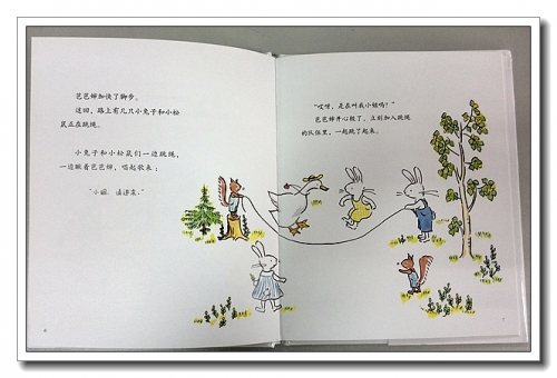 开本比A4纸的一半宽点,30页左右,硬皮精装,质量很好。画风简洁可爱,颜色搭配明亮,极富童趣,空间留白不少,整体布局开朗空旷,赏心悦目。文字中等,篇幅略长