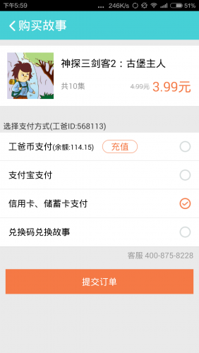 1、购买故事:在故事详情页,点击“购买”后,支付方式选择“信用卡、储蓄卡支付”。