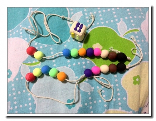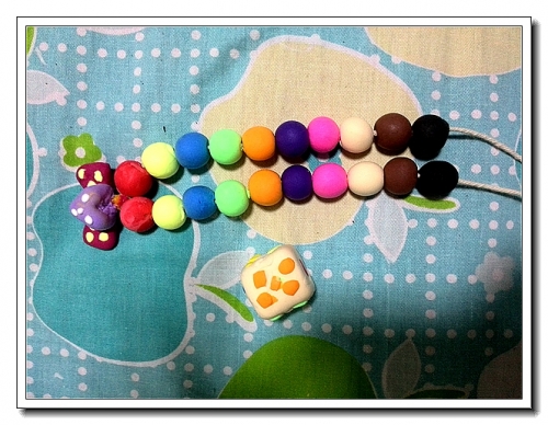 用橡皮泥捏十个彩珠(其实十个就够了,多捏了一套是因为妈妈做了一套,婷自己做了一套),半干时用毛衣针穿孔,干后穿到绳子上。