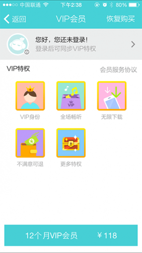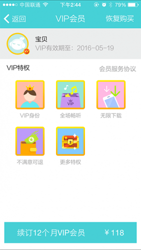 第三步:口袋故事iPhone版,仅支持购买12个月VIP会员。开通VIP会员,可在会员期内畅听全部VIP故事。非VIP会员仅能试听部分章节。
