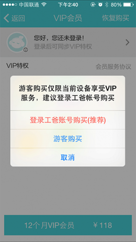 第四步:建议您选择“登录工爸账号购买”VIP会员服务,登录购买能方便您在其他苹果设备上使用。如不慎丢失,可通过工爸账号找回VIP会员信息。