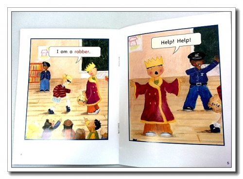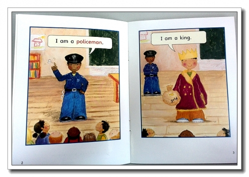 譬如《Josie and the Junk Box》,前面看到每个小孩子在找东西,有的找到毛线,有的找到扣子,有的瓶子、吸管、盒子,然后小朋友们动手装饰,我还没反应过来,翻过来,却看到了一个小怪物,这根本就是一本手工书嘛,短小的故事也能给出这样的效果。还有《The Play》,3个孩子扮演国王警察盗贼,简单的对话却完成了一个小剧场,而且给我一种启发,果然是不在于你会说多少,更在于你能根据场景表达出多少,这样一部小戏,全家上阵,每人记两句就能一起演。
