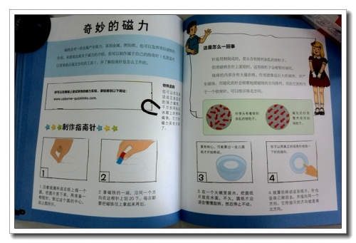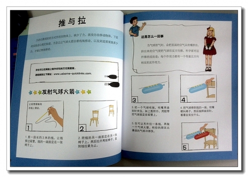里面的一些小实验我们以前也作过,不过是零散搜集的,也没有系统的讲解,就图个高兴。而这次,孩子可以看着图,自己找材料,自己操作,自己寻找答案,兴趣更是高涨。