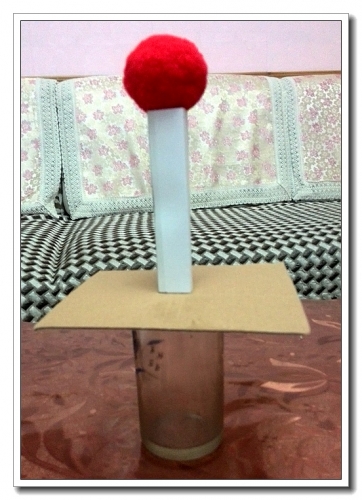 第二天,我们做的是“坠落的橙子”,其实就是惯性实验,以前也作过,但当上面的物体变成圆圆的绒球,实验不好就会滚下来时,多了几分趣味。