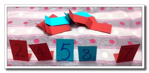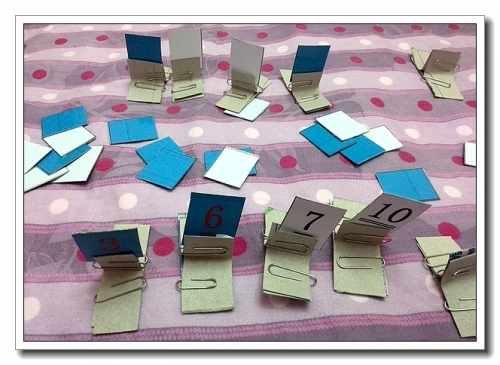 两色卡纸各一张,猜成大小相同的长方形,中上部写上0-11的数字,下部弯折,这样就能竖立起来了。