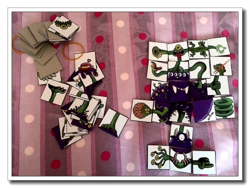 ps:见HABA桌游里规则经常是什么最近谁看过XX故事的先出,先去过哪里哪里的先出。于是我也效仿了一下,上次婷和一个小朋友的玩的时候,谁都想先出,我就说谁讲一个怪物故事,讲的好的先出……我能说我觉得我闺女讲得比较好吗?为了中国人的客套,我想让闺女让给对方,但婷认为对方比她大,所以拒绝……僵持得好尴尬啊,好在婷还是很懂事滴,自己说这次小朋友先,下一局婷先。