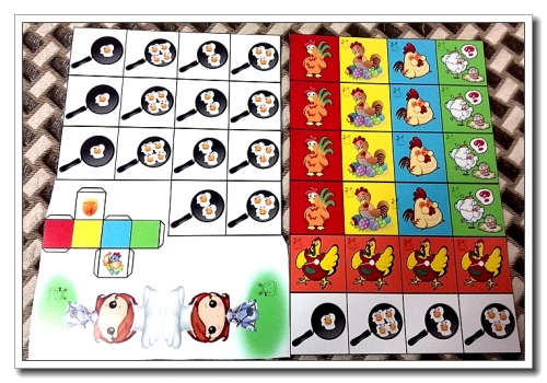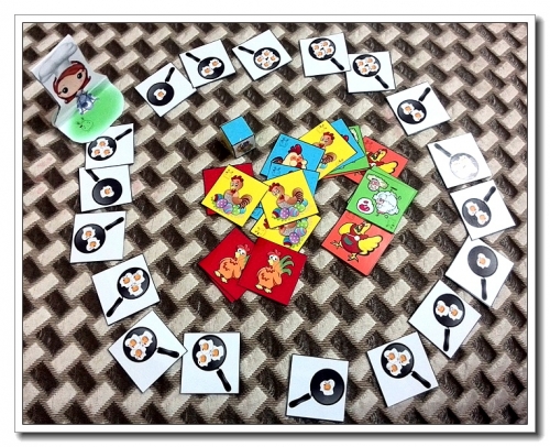 规则大概是把各种颜色的鸡翻扣好,锅转圈摆在周围,人物随机放置在一口锅前,锅里的鸡蛋数就是你要连续翻出的鸡的数量。投掷色子,色子的颜色表明你需要找的鸡的颜色。比如立在3个荷包蛋的锅上,扔了个红色,就需要连续翻3张背景为红色的鸡。