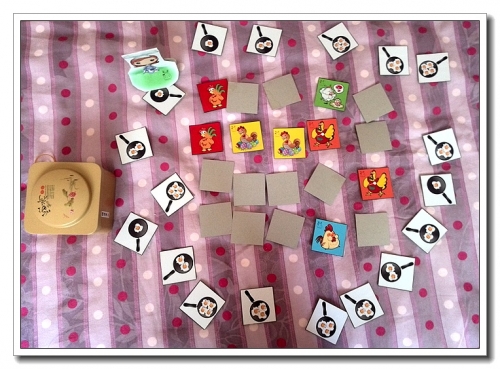 煎鸡蛋,听这个名字就觉得很有趣啊。而且也的确很容易DIY。颜色又丰富又漂亮,就想着婷肯定会喜欢。这个其实不难,从网上找各种鸡的图片就好了,结果时间浪费在我这个选择综合症上了,看看这个也好,那个也好,舍不得取舍,于是一方面为了不用舍弃我挑选的素材,一方面为了满足婷的红黄蓝绿橙的色彩强迫症,一方面为了添加难度,我比原版多出一个色来。悲催的是,贴好了后才发现,不知道谁在桌子上洒了点水,红色的鸡背面被洇湿了,即使干了,也能看出痕迹来。所以我们玩的时候,就把红色的放弃了。所以不差钱又有闲的话,可以考虑覆膜啊。