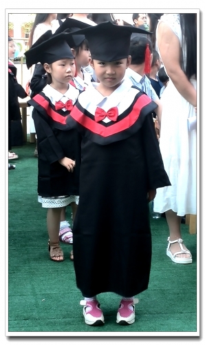 在一些家长们的建议下,幼儿园给孩子们准备了学士服,小小的孩子穿起来,真是特别特别萌啊。老师给他们准备了成长之门,每个孩子要穿着学士服走过去。小合唱结束后,老师给发了毕业纪年台和毕业册。虽然也带有利益兴致,但是真有种隆重的感觉啊。