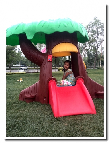 在童话小屋里,婷喜欢让我一次次按门铃,她问是谁,我回答兔妈妈。淘气堡反而不是那么吸引她了,只玩了一小会儿就跑开了。