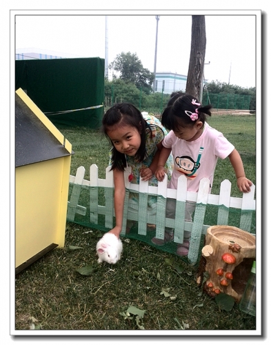 婷特别喜欢捞鱼和喂兔子的环节,我们还带了胡萝卜,婷把胡萝卜分给每一个想喂兔子的小朋友。我才知道,原来兔子喜欢吃蒲公英。婷特别想抱兔子,不过因为小朋友多,如果大家都想抱的话,小兔子会受不了的,婷听了我们的话,只眼巴巴的看着别的孩子去抱。自从那天回来,婷每次都让我揪她的头发假装是揪耳朵提起她来了,然后她就像兔子一样把手和腿蜷在一起,萌得不得了。