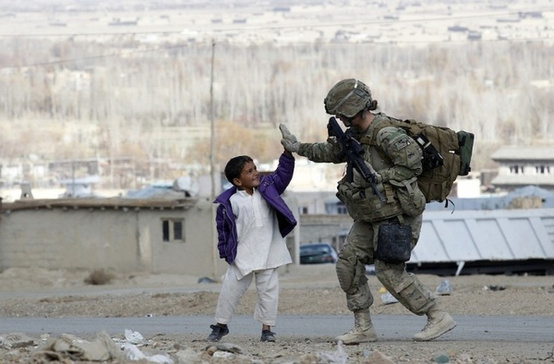 图为一名美军士兵与阿富汗的儿童击掌,非常震撼。
