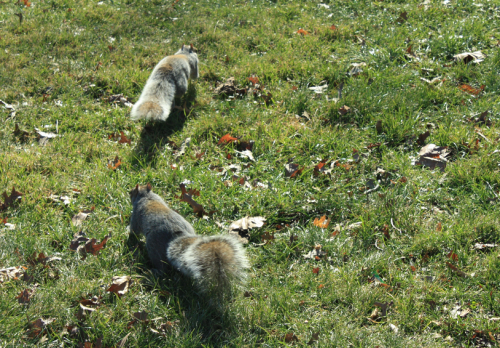 两只松鼠相隔不远,但是动作步调一致