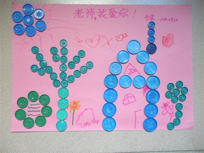 2010年9月10日,教师节前几天,我和儿子商量要送老师什么礼物呢?那一阵儿子特别喜欢画画,恰好那段时间我感冒,喝了口服液,盖子留下来给儿子做数学计算题时用,儿子突发奇想,我俩又到门口的诊所找了一些瓶盖,于是便有了这个手工作品。