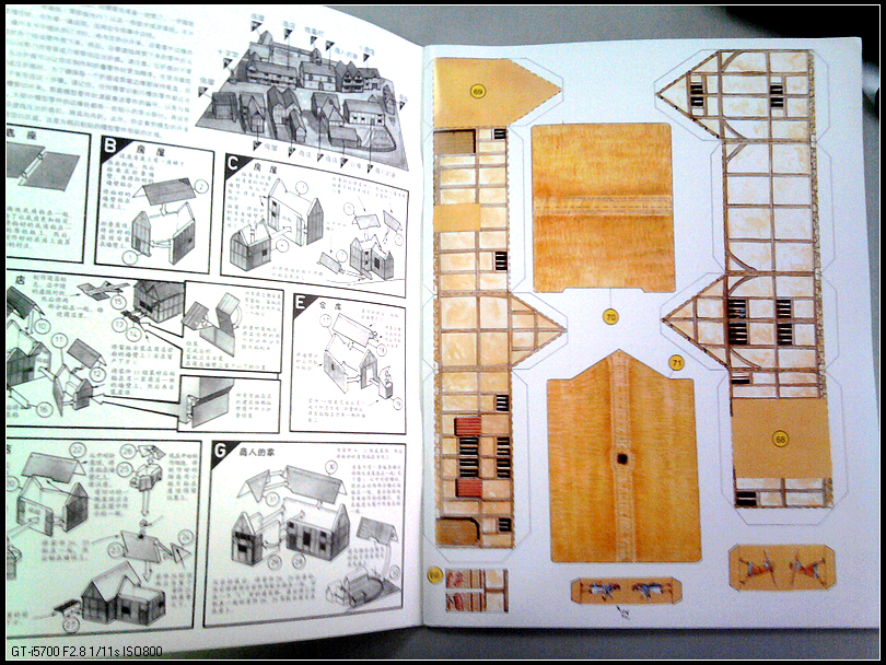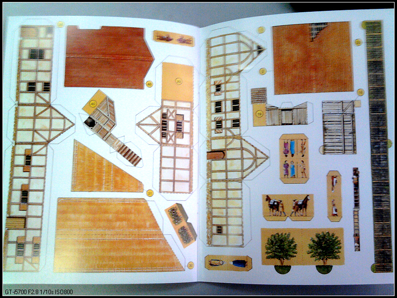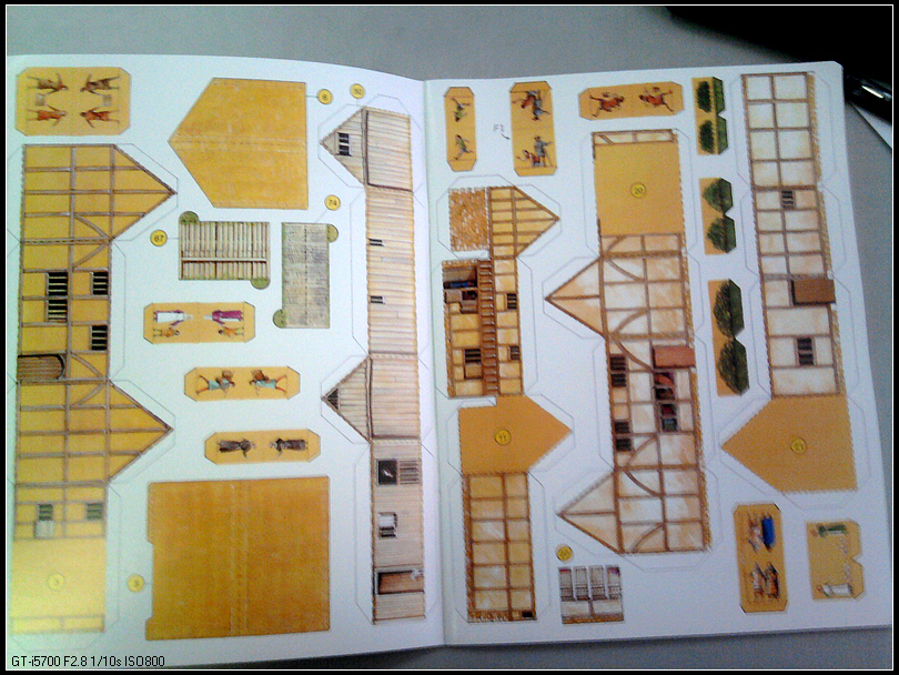 翻开内页,先被封二大量的文字小小震撼了一下——好复杂啊,不过仔细去看图,其实也没那么复杂。沿着书上的线条剪下来,然后按照标记折起来就行了,还有编号,一一对应指示。最简单的就是人物和树、马,剪下来对折就可以。画面非常精美,人物衣饰清晰可见,房子门窗、屋顶材质细腻逼真。