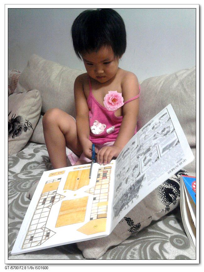 宝宝是特别喜欢做手工的,不过她属于那种凡事都要自己动手的。瞧,拿到书,先是捂了几天——我觉得工程量太大了,她不易完成——每天晚上要抱着睡觉,每天要求要剪。被她磨得受不了了,点头同意,立刻持剪上阵,将我赶到一边。